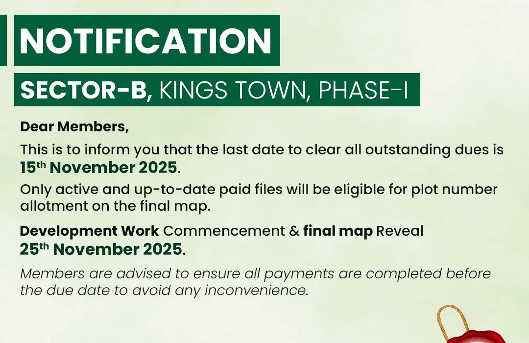 A new era begins! Kings Town Sector B Master Plan unveiled & Land Tour Ceremony a huge success! Thanks for your enthusiasm. Exclusive amenities, 150ft wide main boulevard & more! Clear your dues by March 20th & get 100% waiver on surcharges & restoration fees