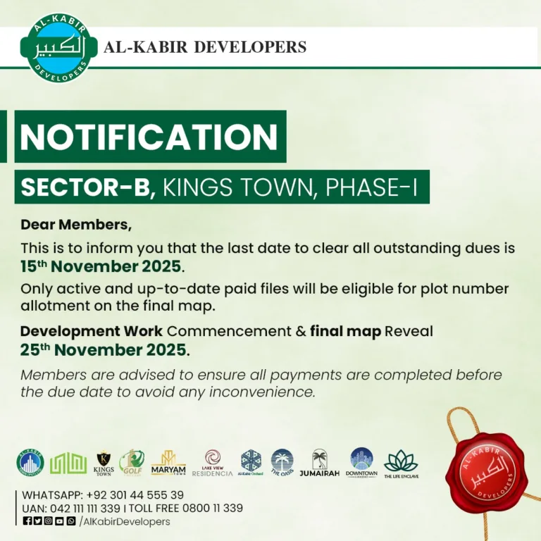 Al-Kabir Developers will be closed on Thursday, 14th August 2025 for Pakistan’s Independence Day. Regular operations resume on Friday, 15th August 2025. August 13, 2025
